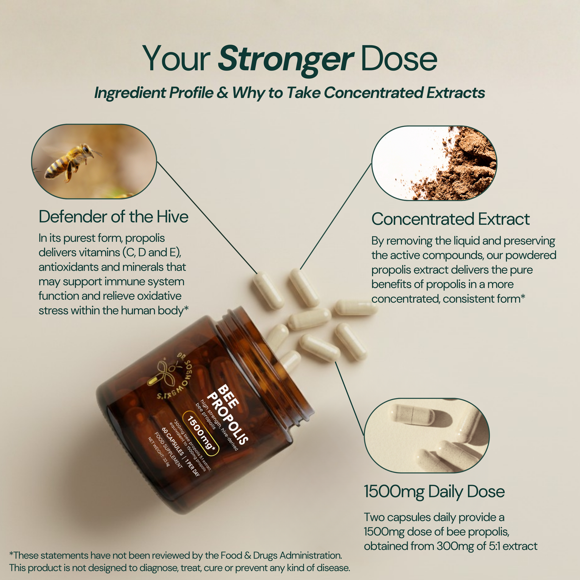 Higher-strength capsules provide 300mg of concentrated 5:1 extract, equivalent to 1500mg of Bee Propolis per serving for a potent daily dose of hive benefits