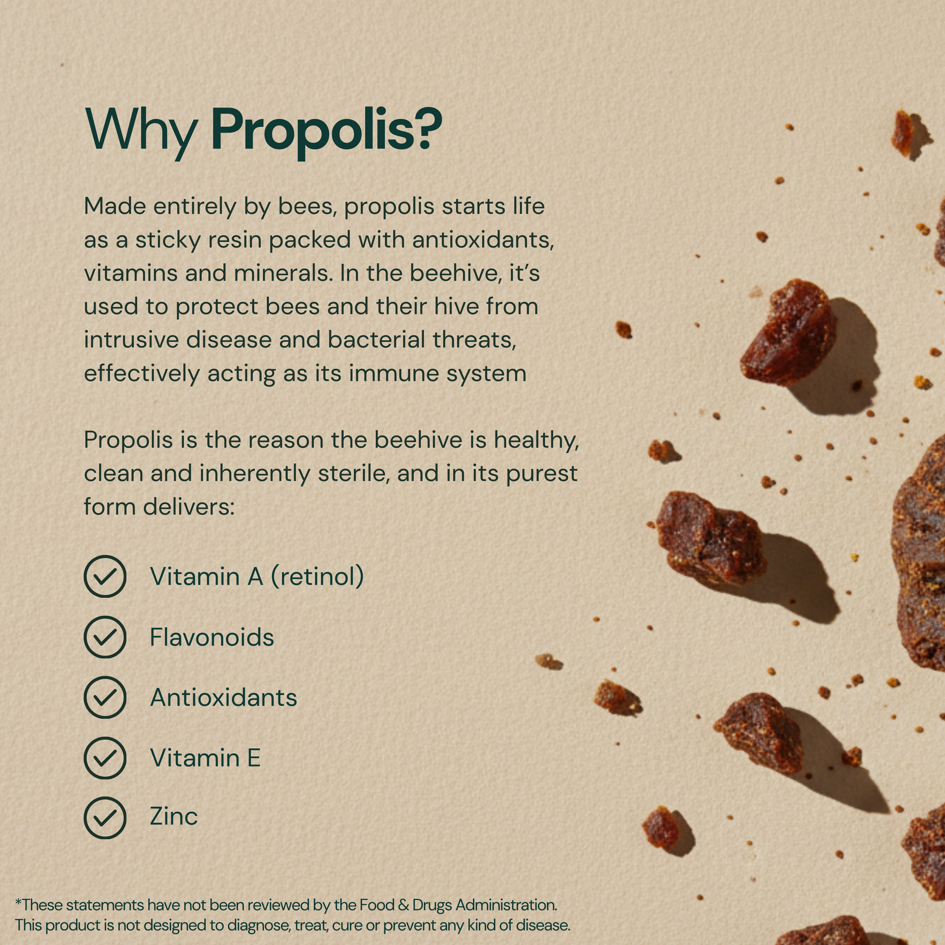 Propolis is made by bees from a combination of plant resins and bee enzymes and is plastered – like a fresh coat of paint – all around the hive’s walls to protect the colony against disease. It's an ingredient totally unique to the beehive