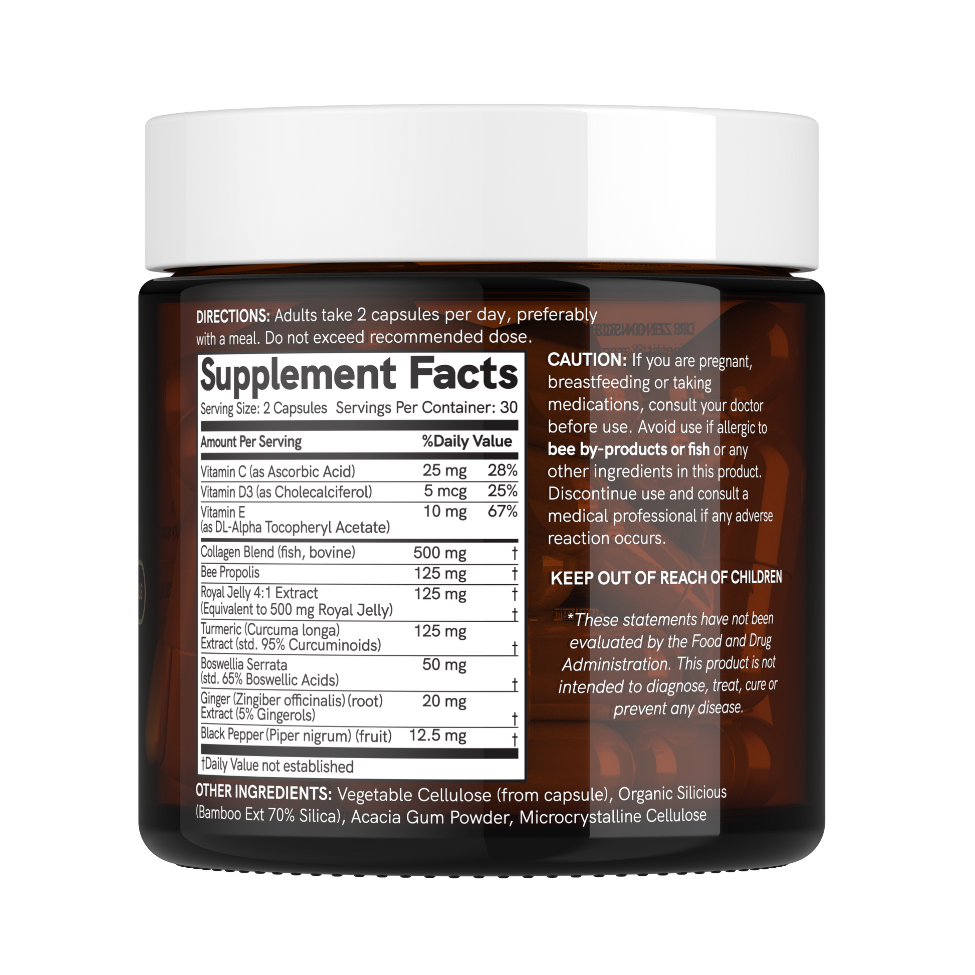 INGREDIENTS: Vitamin C, Vitamin D3, Vitamin E, Collagen Blend (Fish, Bovine), Bee Propolis, Royal Jelly 4:1 Extract, Turmeric, Boswellia Serrata, Ginger, Black Pepper