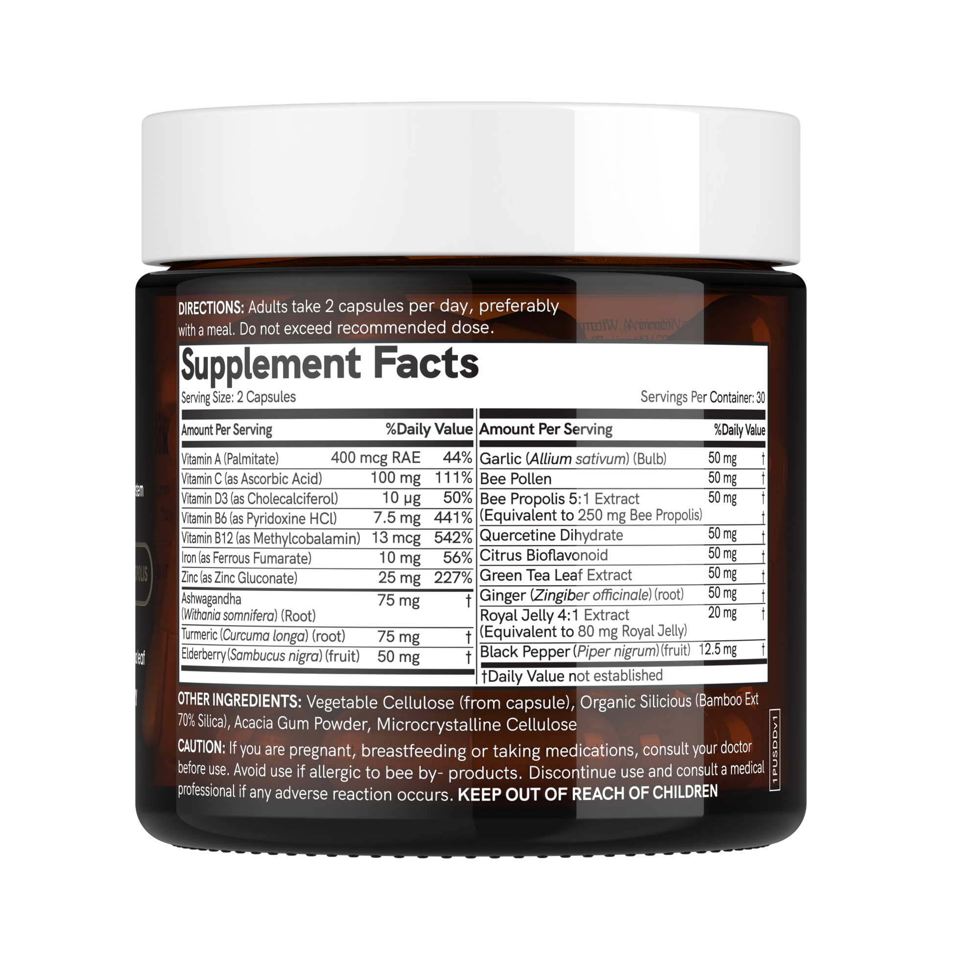 BOTANICALS & ANTIOXIDANTS: Ashwagandha, Turmeric, Elderberry, Ginger Root, Garlic, Green Tea Leaf, Quercetin, Citrus Bioflavonoids, Black Pepper Extract