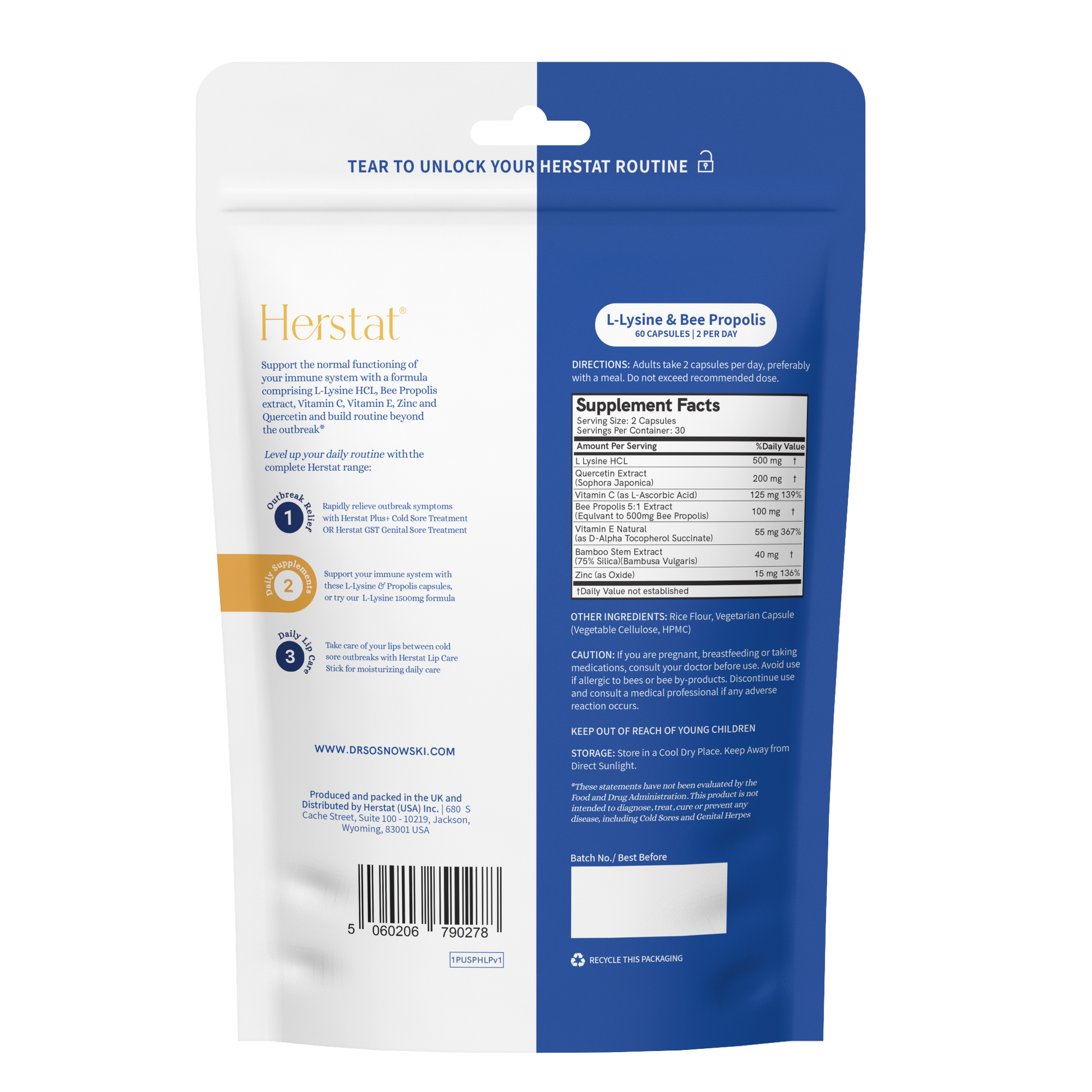 Each pouch of L-Lysine & Propolis contains 60 capsules, equivalent to a 30 day supply. Adults should take 2 capsules per day, preferably with a meal