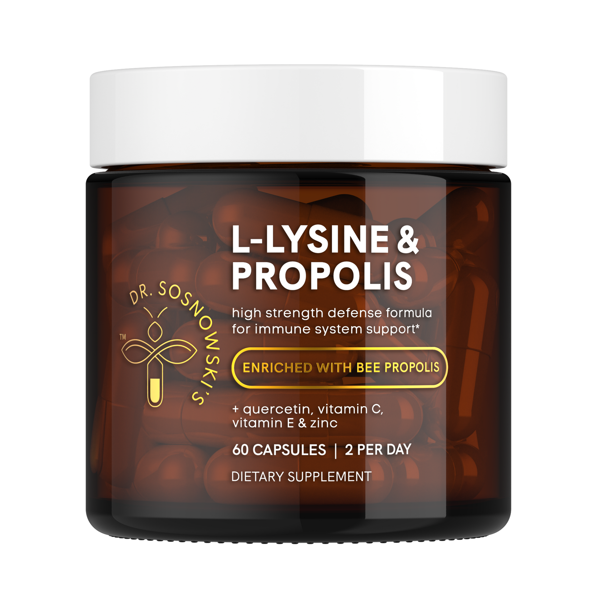 Support your immune system with a fusion of science and nature combining high-strength L-Lysine HCL (the most absorbent form of Lysine) with Bee Propolis Extract (our hero hive-derived ingredient with 300+ beneficial compounds) alongside Quercetin, Vitamin E, Zinc and Vitamin C for normal immunity function.